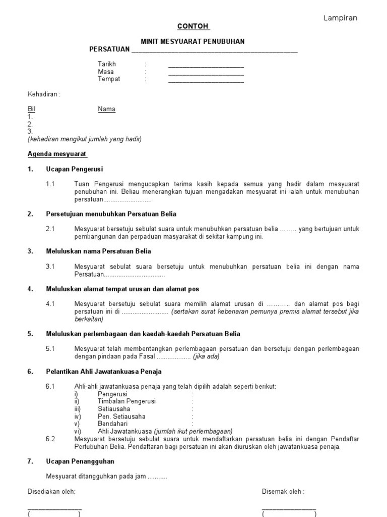 Documents similar to contoh minit mesyuarat penubuhan persatuan. Minit mesyuarat adalah satu laporan mengenai perkara yang dibincangkan atau diputuskan dalam sesuatu mesyuarat. 14 januari 2015 (khamis) masa : Minit mesyuarat atau minutes of meeting (mom) merupakan dokumen yang penting dalam mengetahui perjalanan sesuatu mesyuarat. Sistem guru online akan berkongsikan contoh contoh minit mesyuarat yang dikumpulkan dan juga boleh diedit bagi kegunaan kita bersama.