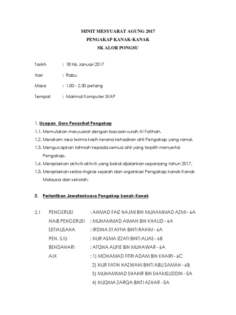 Doc Minit Mesyuarat Agung Kelab Ping Pong 2016 Norhayati Mohd Lazim Academia Edu from 0.academia-photos.com Ini kerana ia akan menjadi panduan dan rujukan buat pekerja dan orang yang hadir atau tidak untuk mengetahui hasil keputusan sesuatu mesyuarat. Mohd januri aiyub jabatan pengajian melayu institut pendidikan guru kampus sultan abdul halim fungsi minit mesyuarat menjadi bahan rujukan, tindakan susulan, pelaporan semula untuk mesyuarat akan… Mesyuarat agung ialah perundingan besar oleh sesuatu badan, persatuan, syarikat atau organisasi. Bagi mencapai objektif sedemikian, kita seharusnya mempunyai sumber dan rangka yang pelbagai dalam sampel sampel minit mesyuarat berkenaan. Format (boleh copy / edit). Ianya penting kerana minit merupakan sumber rujukan masa hadapan dimana pada kelazimannya format minit disusun mengikut agenda mesyuarat dan perlu kelihatan kemas. Setiausaha pergerakan pengakap, minit mesyuarat agung. Documents similar to contoh minit mesyuarat penubuhan persatuan.
