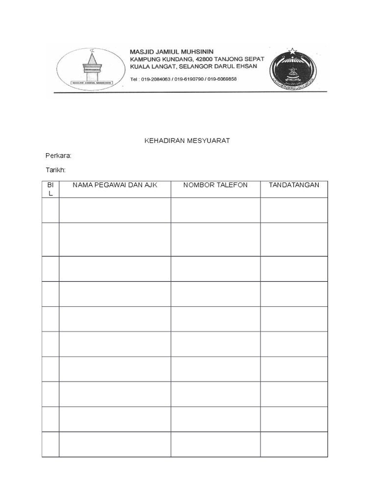 Contoh Borang Rekod Kehadiran Pekerja from imgv2-1-f.scribdassets.com Yab dato' haji hasni bin mohammad. Contoh surat undangan rapat sekolah dengan orang tua. Senarai kehadiran mesyuarat bil 1 by thilaga raman 642 views. 22 januari 4.30 petang tempat : Kehadiran tuan /puan amat diharapkan bagi melancarkan perjalanan mesyuarat ini. Borang penyelenggaraan dan senarai semak komputer. Senarai kelulusan mesyuarat pbkd 220 ?· senarai kelulusan mesyuarat pbkd 220 1. 3.1 ucapan pengerusi 3.2 membentang dan 4.