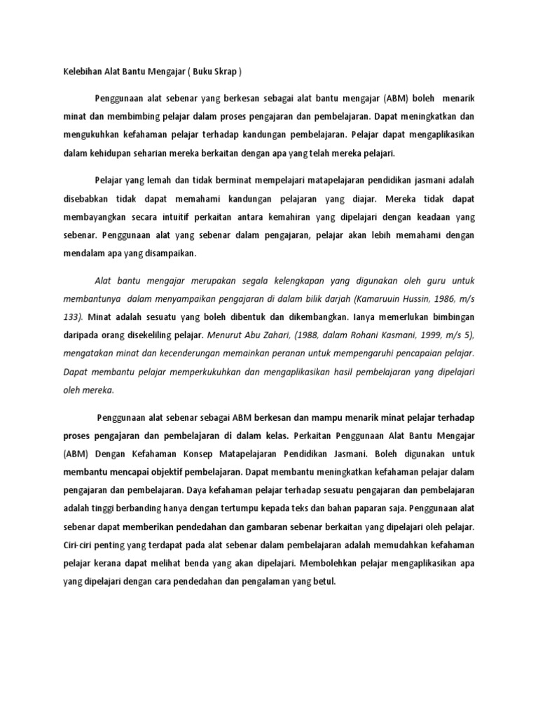Kepentingan serta tujuan alat bantu mengajar (abm). Apa dia alat bantu mengajar? Alat bantu mengajar adalah elemen yang sangat penting dalam proses pengajaran dan pembelajaran. Alat media hanya merupakan alat penyampaian untuk membantu proses pembelajaran. Cara penggunaan bahan bantu mengajar hendaklah diuruskan dengan betul dan cekap supaya pelajar dapat memahami dan mengekalkan konsep atau fakta matematik dalam. Bahan bantu mengajar yang berkualiti dan diselenggarakan dengan baik akan dapat meransangkan para pelajar untuk belajar. Di dalam asri(2000), dinyatakan alat bantu mengajar dapat menarik minat dan Alat bantu mengajar amatlah digalakkan kerana ia merupakan salah satu kaedah bagi melahirkan suasana pembelajaran yang aktif antara pelajar dan guru. (2002) telah menyediakan satu model Sales@learningtools.co.idsales@flexylabs.comcontoh alat peraga,contoh alat peraga fisika,contoh alat pe. Kata kunci pelaksanaan pembelajaran menyeronokkan pengajaran dan pembelajaran bahasa melayu. Dalam proses pengajaran dan pembelajaran yang berkesan alat bantu mengajar (abm) amat penting bagi guru untuk memastikan proses pengajarannya dapat berjalan dengan lancar kerana isi pengajaran yang disampaikan dapat diikuti dengan baik oleh murid dengan bantuan alat bantu mengajar (abm). Academia edu is a platform for academics to share research papers.